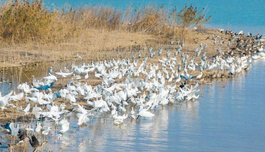 与很多国家级的生态湿地园区不同,这里的环境更加原生,人工改造的痕迹不多。站在湖边,看到湖中心和对岸,有许多鸟类在嬉戏。水鸟的毛发很白,它们或者集体在水边走动,或者慢慢起飞,绕着湖面盘旋再降落。